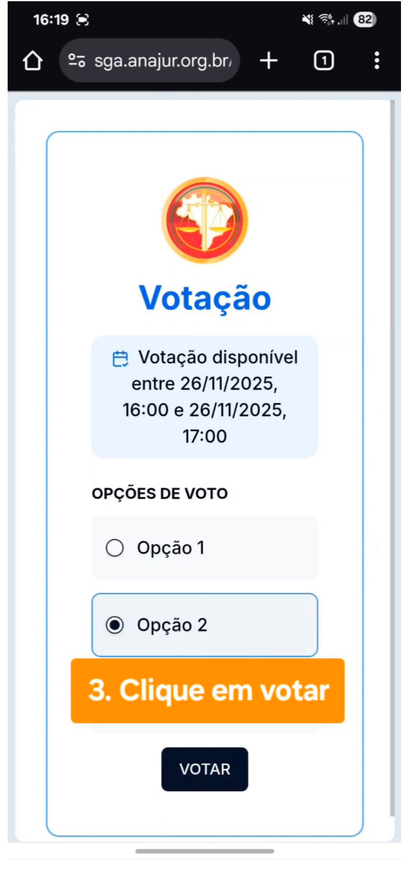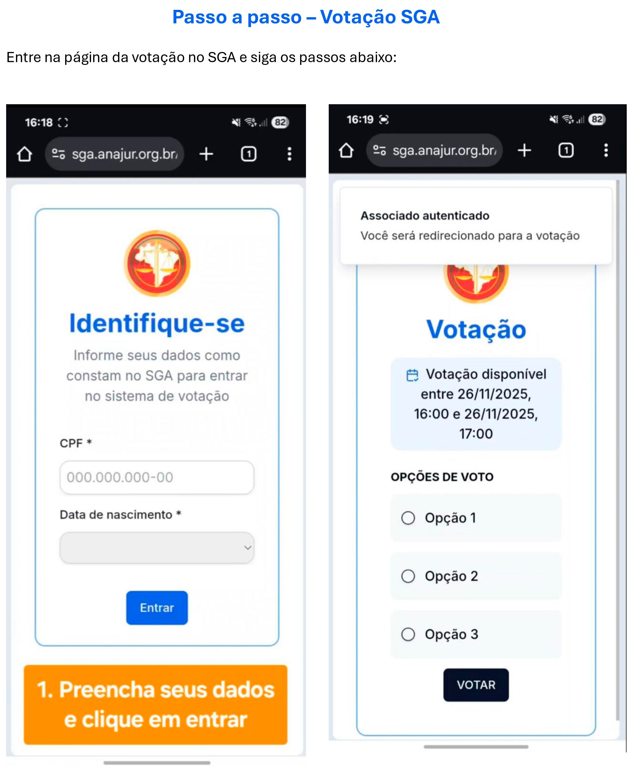 1) O acesso ao sistema de votação deve ser feito pelo botão que será disponibilizado no Menu principal do site da ANAJUR ou pelo link disponível no banner da home page, a partir das 09h; (Vote aqui)