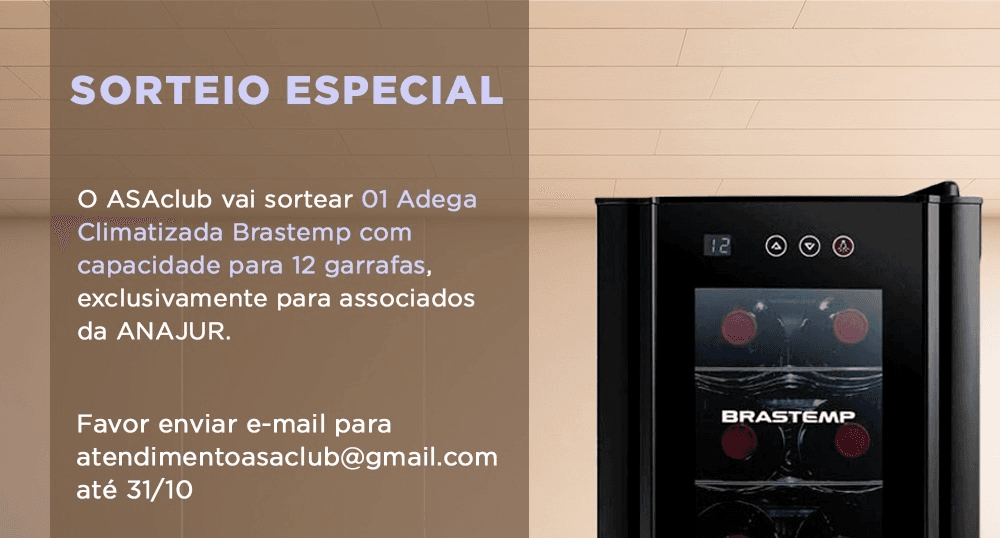 A ANAJUR, em parceria com o ASAclub, preparou uma surpresa especial para seus associados e associadas: um sorteio exclusivo de uma Adega Climatizada Brastemp, com capacidade para armazenar até 12 garrafas. O prêmio será entregue diretamente na residência do vencedor ou vencedora, em qualquer lugar do Brasil.